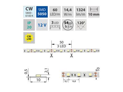 MCLED Pásek LED SMD5050 CW, 60LED/m, 14,4W/m, DC 12V, 1515lm/m, IP20, 10mm, 50m