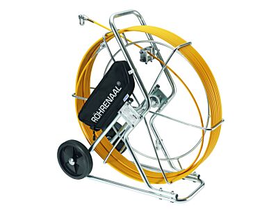 Katimex®Röhrenaal® - systém pro tažení kabelů pro podzemní kabeláž, pozinkovaný trubkový ocelový rám, pojízdný na kolečkách, buben s kuličkovými ložisky a integrovanou parkovací brzdou, kompletní se sklolaminátovou tyčí, 2 startovacími objímkami M12, startovací žárovkou s Ø 25 mm, třmenem, 1 spojovací a 4 napínacími objímkami, 1 speciálním lepidlem 20 g a servisním vakem, délka: 100 m.
