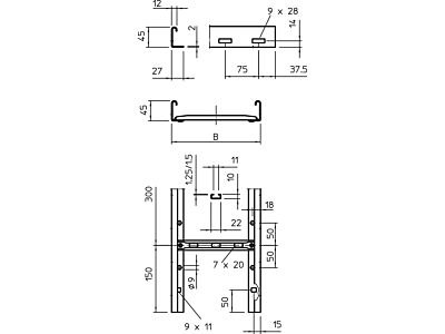 Kabelový žebřík s výškou bočnice 45 mm a s přinýtovaným nahoru otevřeným profilem C příčky.