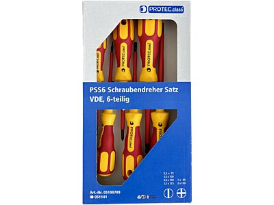 6 dílná sada VDE bezpečnostních šroubováků; Materiál: tvrzená ocel chrom-vanadium, s precizním hrotem; Vícekomponentní rukojeť (tvrdé i měkké zóny), integrovaná závěsná dírka; Nejvyšší ochrana pro všechny druhy práce pod napětím až do 1000 V AC resp. 1500 V DC; Zk oušeno dle EN 60900 (IEC 900) pod zkušebním napětím 10.000 voltů ve vodní lázni;