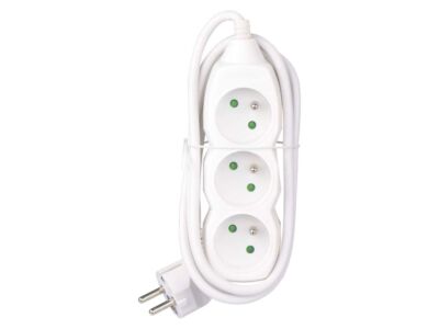 Bílý prodlužovací přívod, 3 zásuvka s délkou 1,5 m a průřezem vodiče 1 mm2. Vhodný pro maximální zátěž 10 A max. Prodlužovací přívod 1,5 m na 230 V~ slouží k prodloužení elektrické energie tam, kam pevná zásuvka nedosáhne.