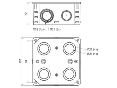 KO 100 - KRABICE ODBOČNÁ, konfigurace KA, barva ŠEDÁ, balení - 74 ks - velké množství průchodů pro zavedení kabelů a trubek