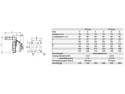 zásuvka vestavná 5-pólová, 32A / 400V, 6h, IP67, příruba 75x75mm, přímá