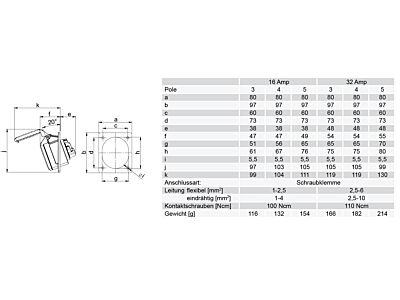 zásuvka vestavná 5-pólová, 16A / 400V, 6h, IP44, šikmá, příruba 80x97mm