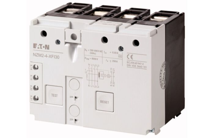 Volitelné příslušenství k řadě výkonových spínačů NZM nabízí bohaté portfolio možností využití při nasazení na celém světě. Montáž je vždy pružná a jednoduchá díky modulárním funkčním skupinám. Upozornění: podle norem IEC/EN 60947-2 není schváleno dle UL/CSA. Vhodnost k používání ve třífázových i jednofázových systémech. Citlivé na pulzní proud na principu součtového proudu. Pro výkonové jističe NZM3(4) a N1(-4) s 1 a 4 póly. Závisí na síťovém napětí Ue = 200 .. 415 V 50/60 Hz. Při I △n = 0.03 A: Doba zpoždění t v vždy pevně nastavená na 10 ms. Varovné hlášení > 30 % I △n žlutou kontrolkou LED. Spouštěcí hlášení lze dovybavit pomocí max. 2 pomocných spínačů (HIAFI): S = M22-K01, rozpínací kontakt = M22-K10 se nulují pomocí resetovací kyvné páčky. Při použití pomocných spouštěcích spínačů v bloku FI pracuje rozpínací kontakt jako spínací kontakt a spínací kontakt jako rozpínací kontakt. Dvojitý kontakt není přípustný. Nepoužívat v kombinaci se skříňkami z izolačního materiálu nebo montážními kity hlavního vypínače k vestavbě do bočních stěn s montážním úhelníkem. NZM1-XFI..R nepoužívat v kombinaci s dolním krytem NZM1-XUSA. NZM1-XFI..U nepoužívat v kombinaci s pracovní nebo podpěťovou spouští, předbíhajícím pomocným spínačem. Schopnost vypínání při jmenovitém mezním zkratovém proudu je ovlivněna namontovaným NZM1, NS1. Při použití výkonového vypínače N1 prostřednictvím předřazené pojistky, kterou je třeba instalovat. Viz Technická data. Lze použít pro: NZM1, N(S)1