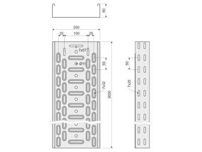 Kabelový žlab KZ 60x200 z plechu tloušťky 1,5 mm pro spojení pomocí spojky, v povrchové úpravě sendzimir, děrovaný, opatřený embosy pro zvýšení pevnosti a tuhosti, certifikovaný pro systémy se zachováním funkčnosti při požáru