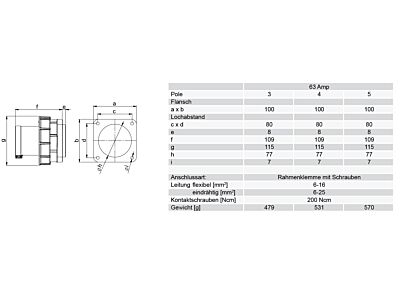přívodka vestavná 4-pólová, 63A / 500V, 7h, IP67, přímá, příruba 100x100mm, POWER TWIST