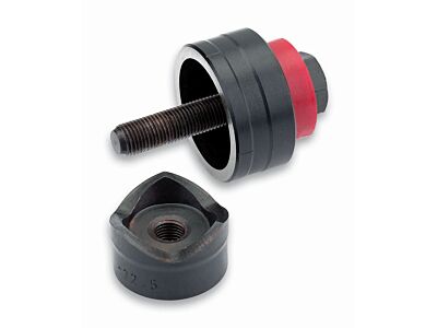 Kulatý šroubovací průbojník BASIC vhodný pro: Provedení: ocelový plech (ST 37), plast a hliník. Provoz: Ruční a hydraulický, děrování odpadu se provádí v 1 dílu. Provedení: S razníkem, matricí a tažným šroubem s kuličkovým ložiskem (zapouzdřeným) : Jmenovitý rozměr PG 29, otvor ø 37,0 mm, rozměr šroubu 19x55,0 mm, pilotní otvor ø 10,0 mm, max. tloušťka materiálu 2,0 mm.