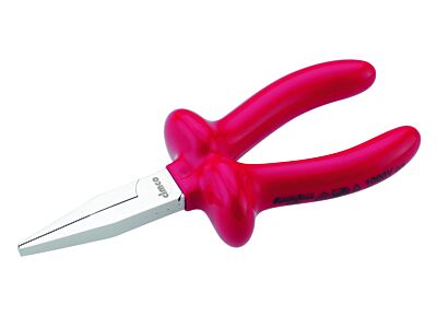 Ploché kleště s napětím 1 000 V (dlouhé kleště) - rukojeti s dvoubarevnou plastovou izolací pro optimální bezpečnost. Pokud dojde k poškození vnější červené izolační vrstvy, nyní viditelná spodní oranžově zbarvená plastová izolace signalizuje, že již není zaručena 100% bezpečnost v souladu s bezpečnostními normami. Ploché kleště (dlouhé kleště) DIN ISO 5745, délka 160 mm (6"), s vloženým kloubem a dlouhými plochými čelistmi. Délka čelistí 50 mm, vroubkované úchopové plochy.