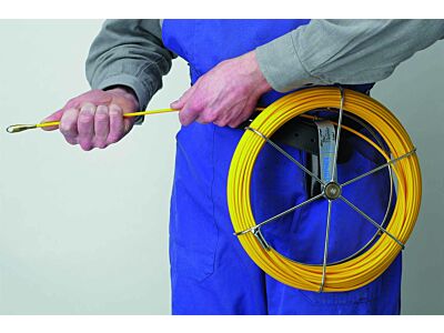 Katimex®-Kabelmax® - profesionální podlahový kabelový tahový systém pro snadné tažení kabelů do prázdných nebo obsazených kabelových kanálů nebo trubek do Ø 60 mm, kabelový tahový přístroj pro podlahové kanály kompletní se sklolaminátovým profilem Ø 4,5 mm, 2 startovacími objímkami M5, startovací baňkou Ø 11 mm s tažným okem Ø 6 mm, ekonomická verze 40 m.