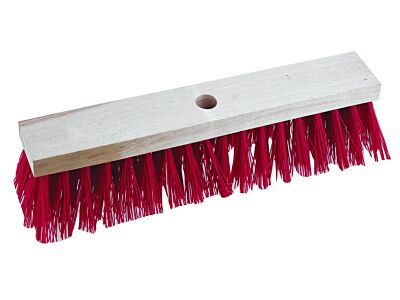 Silniční smeták na hrubé a odolné, i vlhké nečistoty na silnicích a továrních plochách, obzvláště odolná syntetická vlákna (Elaston), z plochého dřeva s otvorem pro násadu, bez násady, barva červená, délka 400 mm.