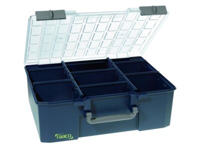 Kufr Carry-Lite 150-9 s U-profily ve víku, které zabraňují vyklouznutí obsahu během přepravy, včetně vyjímatelných přepážek, vybaven 2 posuvnými západkami a držadlem na přenášení, 2 červené značky na západkách indikují, zda je kufr správně uzavřen, nosnost: 20 kg, hmotnost: 1 822 g Barva: raaco blue. Provedení: prázdné; rozměry: DxŠxV 330x413x147 mm