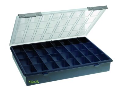 PSC Fix, krabice na sortiment s pevnými vnitřními přepážkami. Typ fix-32; počet malých přihrádek: 32; hmotnost: 0,82 kg; rozměry: DxŠxV 338x260x57 mm.