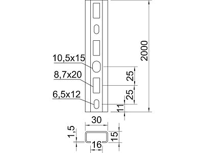 Profilová lišta děrovaná, šířka výřezu 16 mm.
