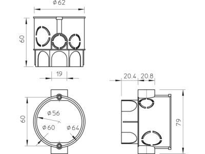 Přístrojová / propojovací krabice se zaručenou normalizovanou středovou roztečí přístrojů 71 mm (dle DIN 49 073-1) a ochranou proti pootočení pomocí spojky Snap-Rast. Vylomitelné otvory pro vedení a trubky Ø 20 mm a Ø 25 mm. Kombinovatelné rozpěrné a šroubové upevnění, hluboko umístěné omítkové držáky, vzdálenost šroubů přístroje 60 mm, pro šroubové upevnění pomocí samořezných šroubů 3,2 mm, s 2 nálitky pro šrouby, bez šroubů, stupeň krytí IP20.
