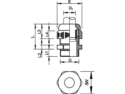 Robustní kabelová vývodka kloboučkového tvaru s velkou těsnicí oblastí, s odlehčením tahu a zajištěním proti pootočení pro vysoké nároky na těsnost.