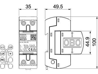 • Schopnost svodu bleskových proudů 50 kA (10/350) na každý pól a až 150 kA (10/350) celkově