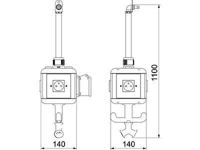 3 × jednoduchá zásuvka se zemnicím kolíkem 16 A / 250 V se zvýšenou ochranou proti nebezpečnému dotyku, předem zapojeno na jeden okruh střídavého proudu, připojení pomocí třípólové svorky, 1 × zásuvka CEE 16 A / 415 V, s přepážkou k oddělení proudových okruhů.