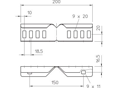 Úhlová spojka jako vnější spojka pro spojení kabelových žebříků a tvarových dílů s výškou bočnice 45 mm a průchozím děrováním bočnice.