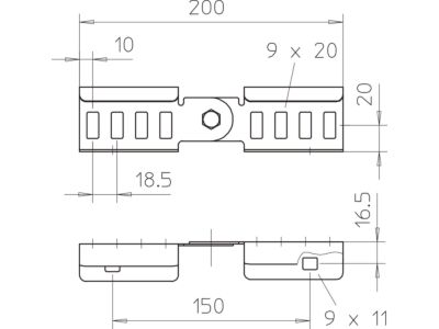 Kloubová spojka jako vnější spojka pro spojení kabelových žebříků a tvarových dílů s výškou bočnice 45 mm a průchozím děrováním bočnice. Úhel svisle nastavitelný.