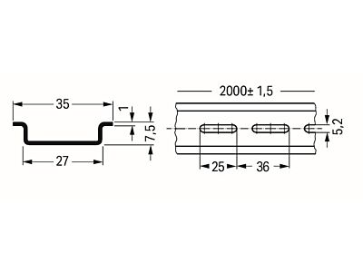 Ocelová nosná lišta; 35 × 7,5 mm; Tloušťka 1 mm; Délka 2 m; Děrovaná; Pásově zinkováno; Dle normy EN 60715; Stříbrná