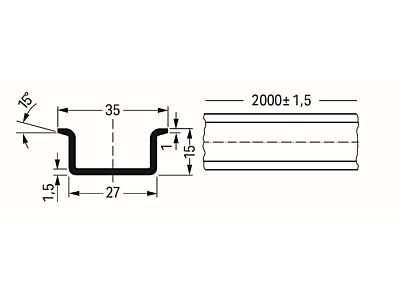 Ocelová nosná lišta; 35 × 15 mm; Tloušťka 1,5 mm; Délka 2 m; Neděrovaná; Pásově zinkováno; Podobné EN 60715; Stříbrná