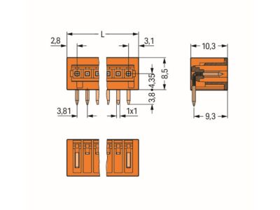 Konektor s pájecími piny THT; Pájecí kontakt 1,0 × 1,0 mm; Úhlové provedení; 100% ochrana proti chybnému zapojení; Rozteč 3,81 mm; 6pól.; Oranžová
