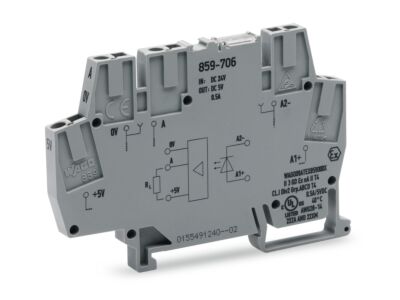 Modul s optočlenem; Jmenovité vstupní napětí: 24 V DC; Rozsah výstupního napětí DC 4–6,25 V; Mezní trvalý proud 0,5 A; 3vodičové připojení / spínání k minusu; Frekvence: 20 kHz; Indikace stavu červená; Konstrukční šířka 6 mm; Šedá