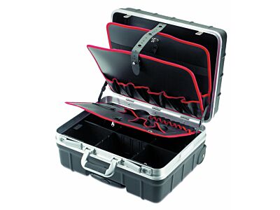 Kufr na nářadí Champion, profesionální kufr s pevnou skořepinou (jako např. CIMCO č. 17 0930) s integrovaným systémem koleček zajišťuje vysokou mobilitu a pohodlí. Díky mimořádně širokým kolečkům na vnějším plášti kufru je kufr obzvláště stabilní proti převrácení. Teleskopický systém lze nastavit do 2 různých výšek a do skořepiny kufru je bez problémů integrována také funkce vozíku. Hladce se pohybující kolečka s velkou osovou vzdáleností zajišťují stabilní valivou funkci. Tři desky na nářadí s 36 kapsami a 12 elastickými lištami různých velikostí nabízejí dostatek úložného prostoru pro bezpečné uložení všech druhů ručního nářadí. Prázdný kufr: 6 850 g. Vnější rozměry: Š/D/H: 478x410x253 mm; vnitřní rozměry Š/D/H1/H2/H#: 465/352/215/40/255 mm.