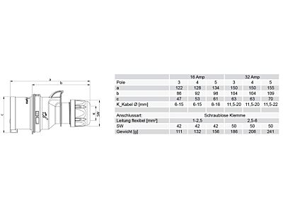 vidlice 4-pólová, 16A / 400V, 6h, IP44, bezšroubová TURBO TWIST