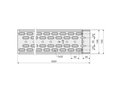 Kabelový žlab s integrovanou spojkou KZI 35x150 z plechu tloušťky 0,75 mm v povrchové úpravě sendzimir, děrovaný, opatřený embosy pro zvýšení pevnosti a tuhosti.
