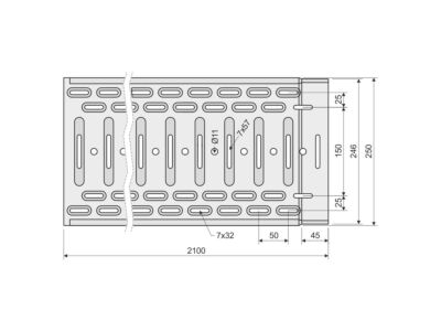 Kabelový žlab s integrovanou spojkou NKZI 100x250 z plechu tloušťky 1,25 mm v povrchové úpravě sendzimir, děrovaný, opatřený embosy pro zvýšení pevnosti a tuhosti.