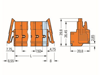2vodičová pružinová svorkovnice; Push-in CAGE CLAMP®; 2,5 mm²; Rozteč 7,62 mm; 5pól.; Boční blokovací západky; Oranžová