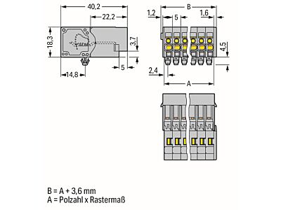 1vodičový konektor s pájecími piny; CAGE CLAMP®; 4 mm²; Rozteč 5 mm; 14pól.; Montáž na lištu DIN 35 / do panelu; Západky; 4,00 mm²; Šedá