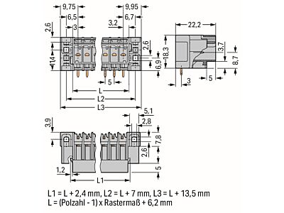 Konektor s pájecími piny THT; Pájecí kontakt 1,0 × 1,0 mm; Úhlové provedení; Průchozí příruba; Rozteč 5 mm; 9pól.; Šedá