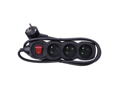 Černý prodlužovací přívod, 3 zásuvka s vypínačem, délkou 1,5m a průřezem vodiče 1mm2. Vhodný pro maximální zátěž 10A max.