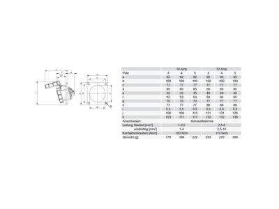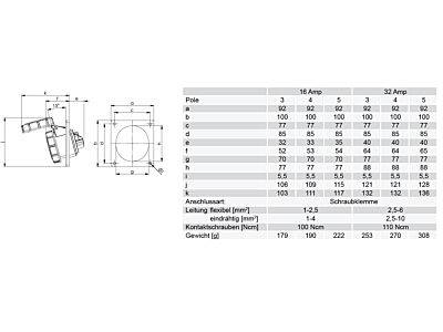 zásuvka vestavná 5-pólová, 32A / 400V, 6h, IP67, šikmá, příruba 92x100mm