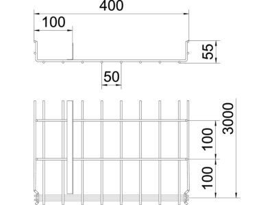 Mřížový žlab s tvarovanou integrovanou spojkou a přivařenou přepážkou s výškou bočnice 55 mm.