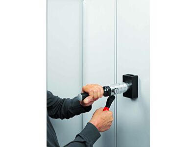 Hydraulický ruční děrovací stroj - Praktický ruční děrovací stroj pro kruhové, obdélníkové a čtvercové děrování v konstrukci rozváděčů a systémů. Bezpečnostní funkce díky přetlakovému ventilu: automatické vypnutí tlaku při 650 barech. Vyrobeno z vysokopevnostního hliníku (cca 40% úspora hmotnosti), ergonomická rukojeť - automaticky pruží zpět - Snadné umístění razníku v kříži díky ovládání jednou rukou Ruční razník - rovné provedení (1,6 kg) - Děrovací síla 75 kN, max. provozní tlak: 650 bar.