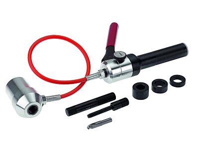 Hydraulický děrovač s ručním čerpadlem; ideální pro stísněné prostory, pro kruhové, obdélníkové a čtvercové děrování v rozváděčových skříních a při stavbě zařízení. Děrovací síla: 75 kN s přetlakovým ventilem. Max. provozní tlak: 650 bar Hmotnost: 2,0 kg. Dodává se v robustním plastovém kufříku. Hydraulický děrovač s ručním čerpadlem, hydraulickým válcem, hydraulickou hadicí 600 mm, 2 hydraulickými šrouby, sadou distančních prvků (3 díly), pilotním vrtákem HSS 11,0 mm.