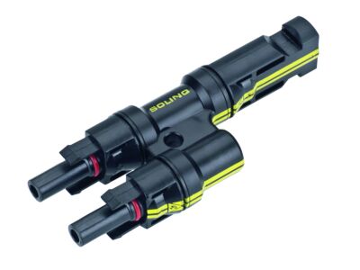 Fotovoltaický Y-distributor MC4, Y-distributor na bázi MC4. Technické údaje: Rozměry vývodů: Ø 4,0 mm, Typ kontaktu: Stamp roll contact, Jmenovité napětí: 1 000 V DC, Jmenovitý proud: 30 A při 70 °C/25 A při 85 °C, Odpor kontaktů: <5 mOhm, Stupeň krytí: IP 68, Teplotní rozsah: -40 °C/ + 90 °C, Certifikace: TÜV. Provedení: FFM = 1x samčí vstup a 2x samičí výstup