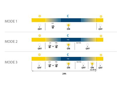 Pokud intenzita světla v okolí klesne pod nastavenou hodnotu, senzor sepne a rozsvítí zapojená svítidla, po opětovném zvýšení intenzity světla spínač svítidla opět vypne