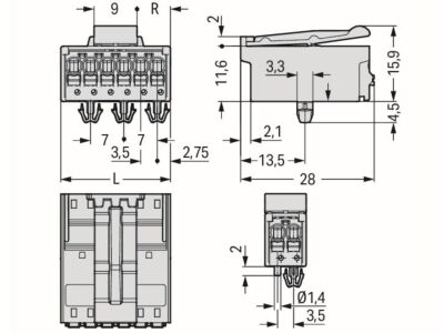 1vodičový konektor s pájecími piny; Push-in CAGE CLAMP®; 1,5 mm²; Rozteč 3,5 mm; 6pól.; Montáž na lištu DIN 35 / do panelu; Západky; Odjišťovací páčka; 1,50 mm²; Světle šedá