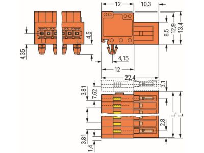 1vodičový konektor s pájecími piny; CAGE CLAMP®; 1,5 mm²; Rozteč 3,81 mm; 4pól.; 100% ochrana proti chybnému zapojení; Montáž na lištu DIN 35 / do panelu; Západky; 1,50 mm²; Oranžová