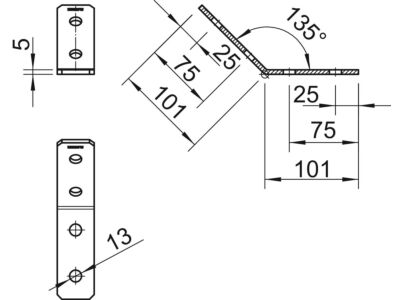Montážní úhelník se čtyřmi otvory pro spojení profilových lišt 41 × 41 mm a 41 × 21 mm v úhlu 45 stupňů.