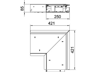 Vnitřní roh připravený k montáži, sestávající ze spodního dílu kanálu, dvou vík, výškově nastavitelných bočnic a kartáčové lišty umístěné na straně stěny, určené k vyvedení vedení. Součástí dodávky je jedno těsnění víka a jedna spojka. Pro výškové nastavení je třeba objednat samostatně čtyři nivelační jednotky.
