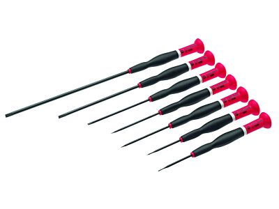 Sada přesných šroubováků, 7 dílů. Ideální nářadí zejména pro nejmenší šroubky na elektronických a elektrických součástkách, rozhlasových a stereo systémech, telefonních systémech a všech komunikačních spojích, pro přesnou mechaniku, elektroniku, modelářství a podobné jemné práce. Čepele ze speciální oceli, barevný kroužek pro identifikaci šroubovacího systému. Pro šrouby s drážkou: 1,0x0,18x40 mm; D: 140 mm (č. výr.: 111860), 1,2x0,25x40 mm; D: 140 mm (č. výr.: 111861), 1,8 0,3x60 mm; D: 160 mm (č. výr.Č. zboží: 111863), 2,0x0,4x60 mm; L: 160 mm (Č. zboží: 111864), 2,5x0,4x75 mm; L: 175 mm (Č. zboží: 111865), 3,5x0,6x100 mm; L: 100 mm (Č. zboží: 111868), 4,0x0,8x150 mm; L: 250 mm (Č. zboží: 111870).