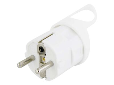 Snadná montáž. Euro provedení. Klasická vidlice pro pohyblivý prodlužovací přívod v bílé barvě, určená pro výrobu prodlužovacích přívodů nebo jako náhradní díl.