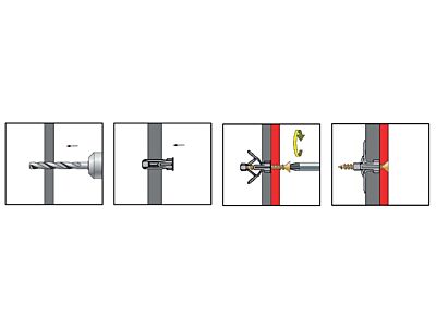 Plastová hmoždinka určená pro upevňování do dutých materiálů. Délka vrutu musí vždy přesahovat délku hmoždinky i s upevňovaným materiálem.