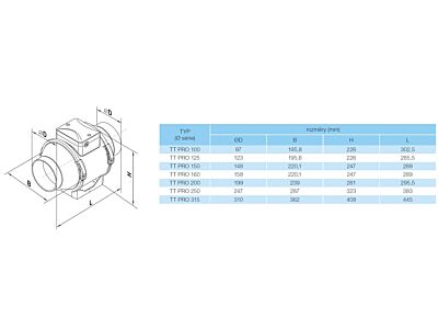 Potrubní axiální plastový ventilátor Vents TT PRO je určen k odsávání nebo přívodu vzduchu v bytových a nebytových prostorách jako jsou koupelny, kuchyně, restaurace, obchody, kanceláře a podobně. Vzhledem ke svým technickým parametrům lze ventilátor připojit k delšímu vzduchotechnickému potrubí s vyšší tlakovou ztrátou. Díky kvalitnímu plastovému materiálu jsou ventilátory tiché a ideální na provoz v prostorách s vyšší vlhkostí. Speciálně navržená konstrukce ventilátoru umožňuje jeho jednoduchou montáž a čištění. Ventilátor má motor se dvěma vinutími, což umožňuje přepínání mezi dvěma rychlostmi. Ventilátor s označením "T" má zabudovaný časovač (T-Timer).